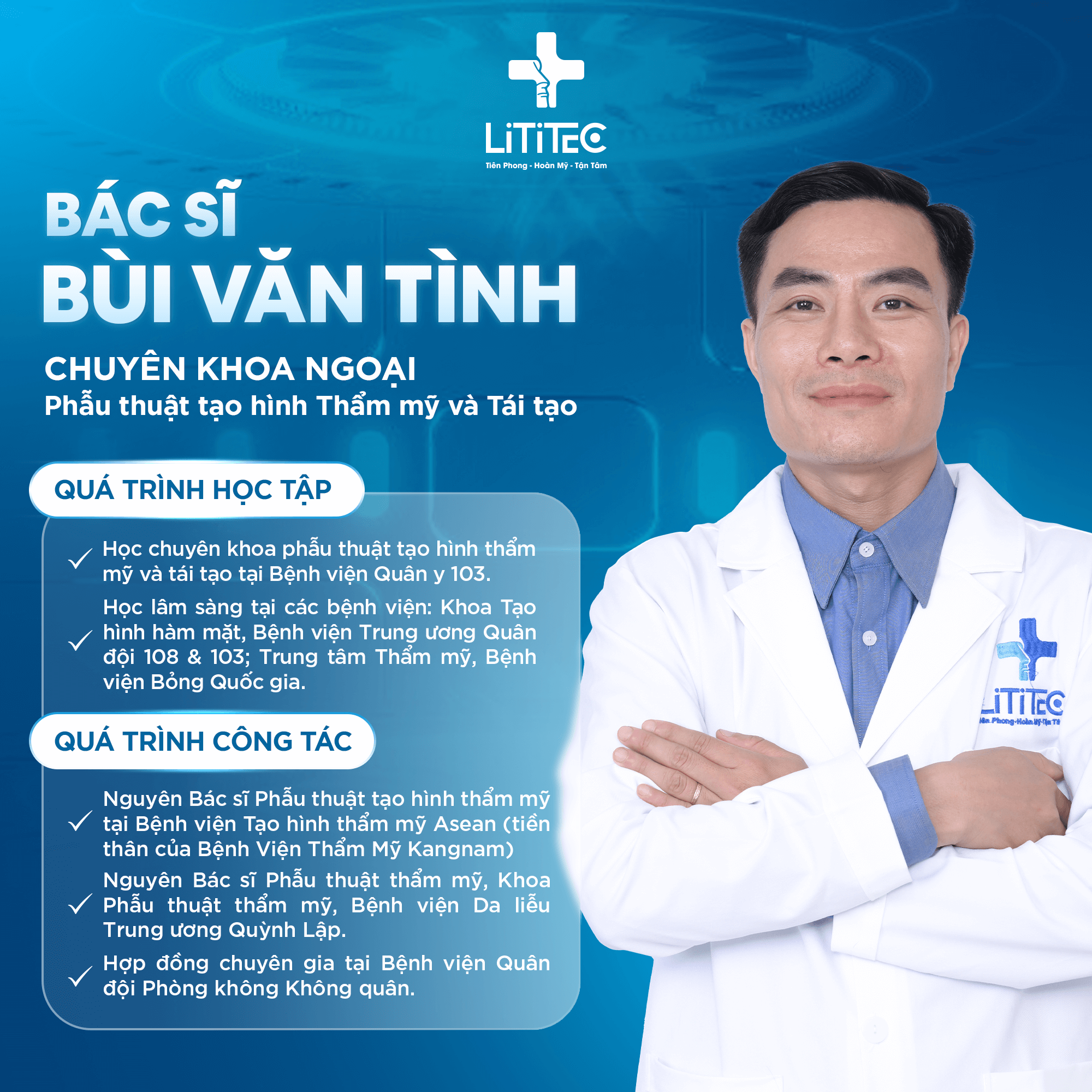 Với nền tảng chuyên môn vững chắc được đào tạo tại các bệnh viện lớn như Quân y 103, 108 và Bỏng Quốc gia, bác sĩ Bùi Văn Tình đã tích lũy nhiều kinh nghiệm thực tế trong lĩnh vực phẫu thuật tạo hình, thẩm mỹ và tái tạo. Trải qua quá trình công tác tại các bệnh viện uy tín như Asean, Da liễu Trung ương Quỳnh Lập và hợp tác chuyên môn tại Bệnh viện Quân đội Phòng không – Không quân, bác sĩ luôn không ngừng trau dồi kỹ năng, mang đến cho khách hàng những kết quả thẩm mỹ an toàn, tự nhiên và tinh tế, giúp họ tự tin và tỏa sáng hơn mỗi ngày.