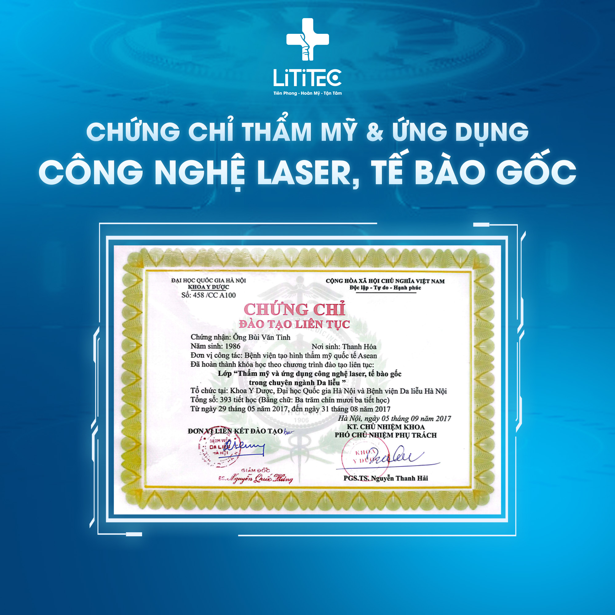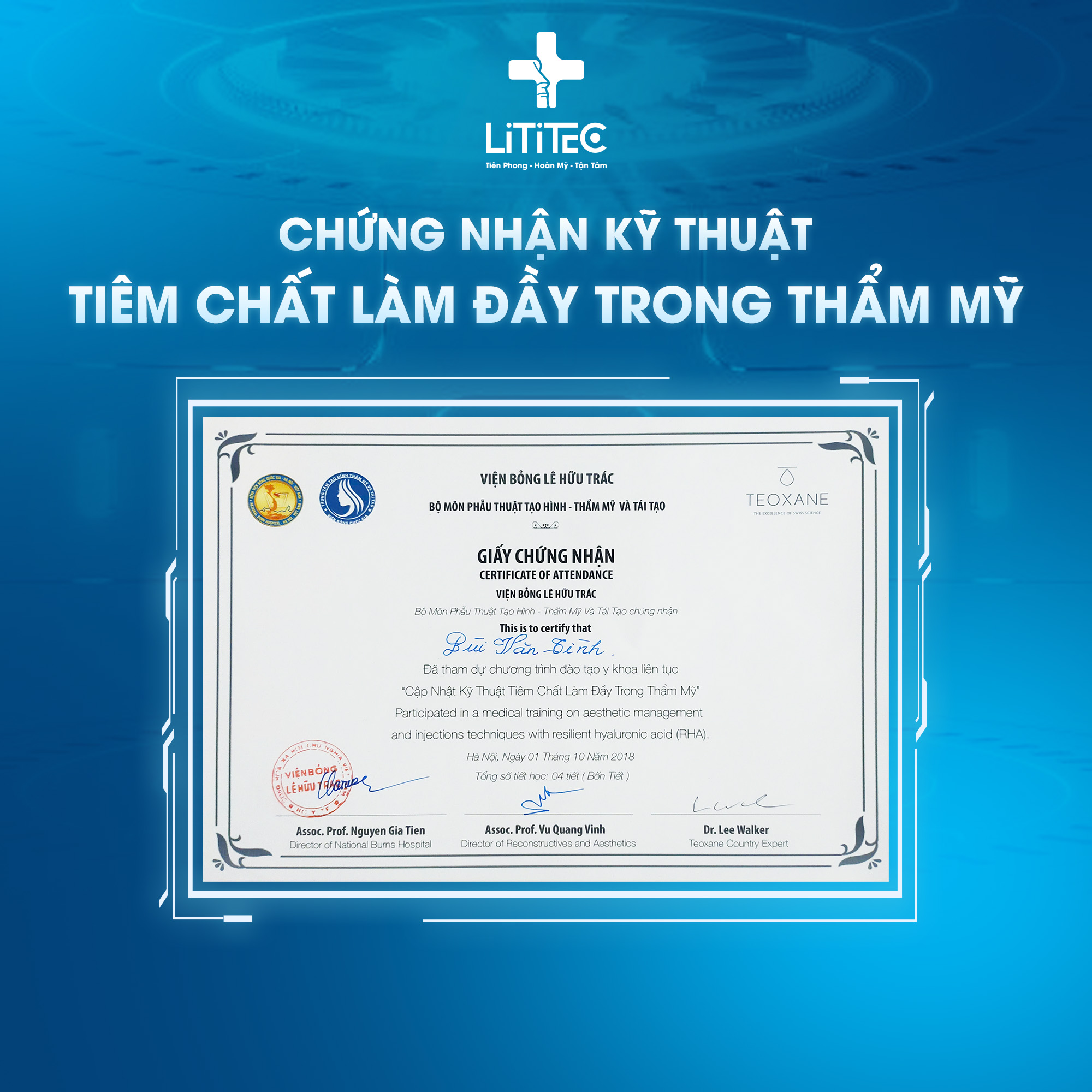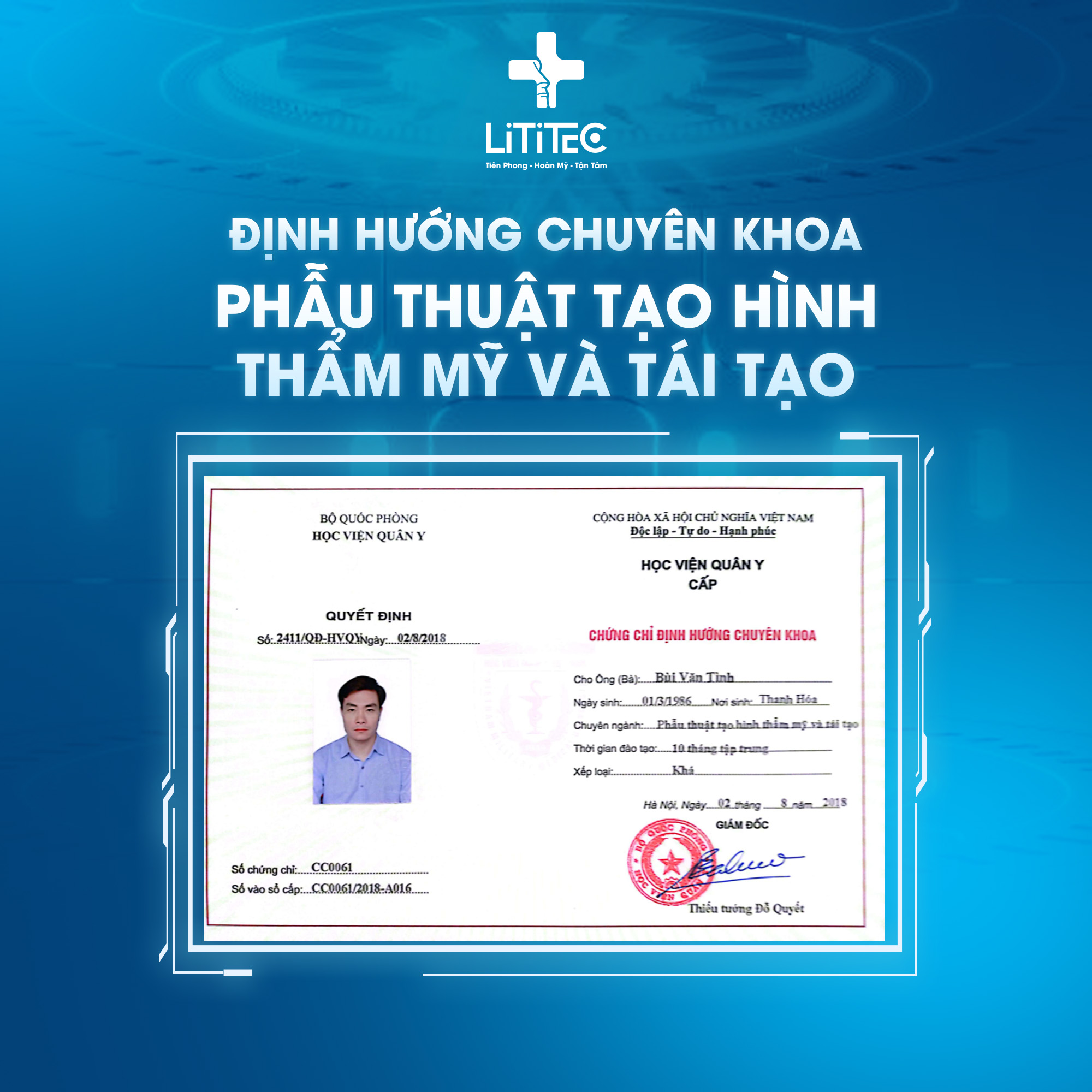 – Học chuyên khoa phẫu thuật tạo hình thẩm mỹ và tái tạo tại Bệnh viện Quân y 103.